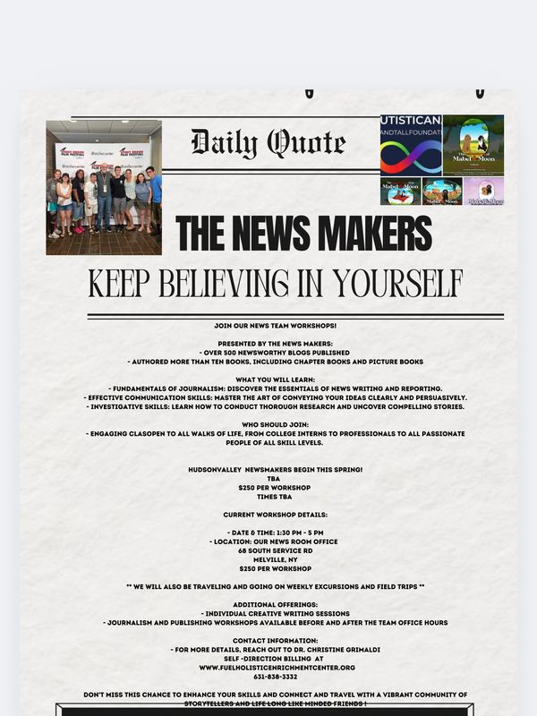 Our News Makers have now created this national blog which is getting so much academic press to help all the kids of all abilities in our nation. This blog will teach you how to be your best selves through your special interests. Please enjoy and share with your friends. We welcome all writers, poets, and artists, through our creative writing workshops. We will help so many kids, "we are stronger as a team than we are alone." Changing kids' lives, one story at a time...Dr. Christine Grimaldi